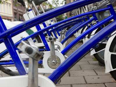 A row of blue bicycles