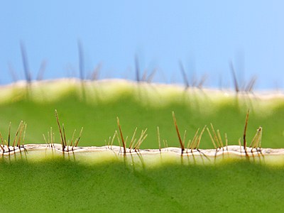 Spines grow on the stem in clusters out of small mounds called areoles.