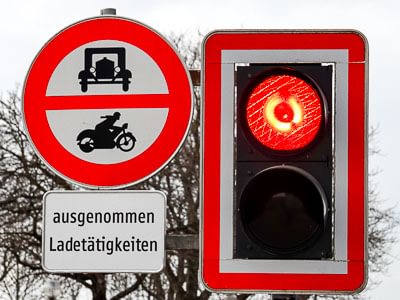 Red stop light at rail grade crossing. No cars or bikes excluding loading activities