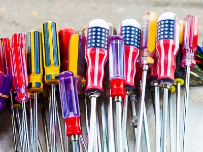 A pile of assorted screwdrivers at a market stall, some with USA flag.