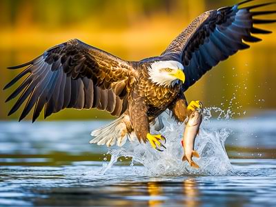 Solve times for this jigsaw puzzlePhotoAn eagle swooping low over a lake and catching a fish in it's talons. Bald eagles are opportunistic feeders, going after what's readily available. That often involves fish, but they also will eat birds, reptiles, rabbits and rats. Share this Jigsaw Puzzle | ||