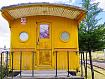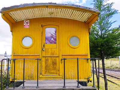 An old preserved train wagon on a siding, painted yellow, round windows, Puno, Peru