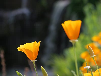 Some golden poppies (Eschscholzia californica) growing by a small waterfall.