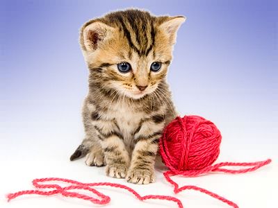 Tabby kitten playing with ball of yarn.